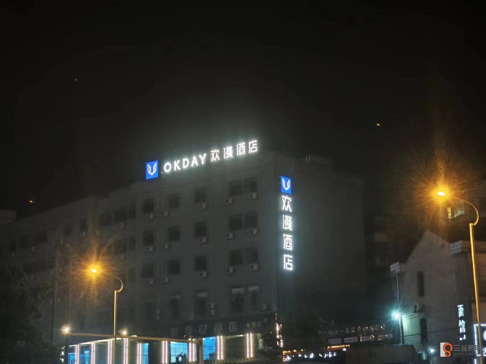益陽市歡漫酒店外墻發(fā)光字采用不銹鋼制作面殼和底亮,亞克力面板,內(nèi)置藍(lán)景光源,熱鍍鋅方通鋼架。
